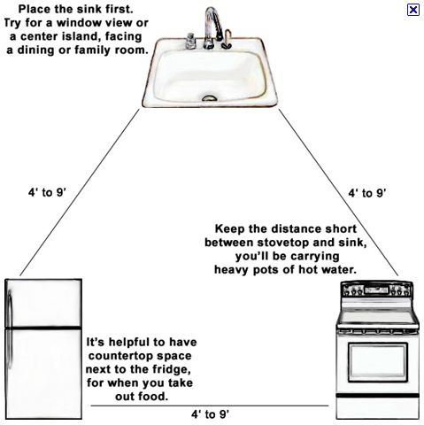 The concept involves spacing apart your 3 main work areas at a reasonable distance. These 3 areas include the sink (prep site), refrigerator (cold food storage) and oven (cooking site). If you space these work areas too far apart you will subsequently be taking too many extra steps and it can make cooking in the kitchen unpleasant and frustrating.